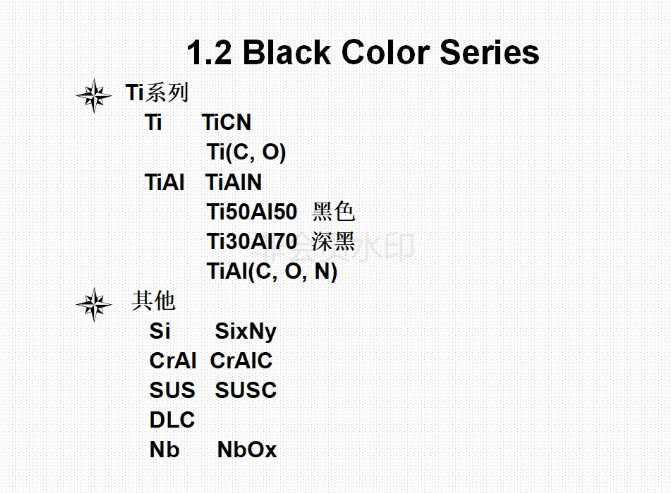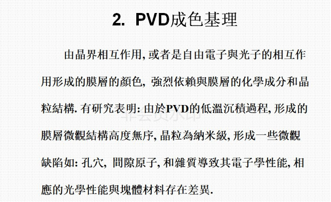 5)、PVD技術不僅提高了 鍍膜與基體材料的結合強度,涂層耗材種類繁多,還有多元復合涂層,形成不同的顏色的表面效果。
