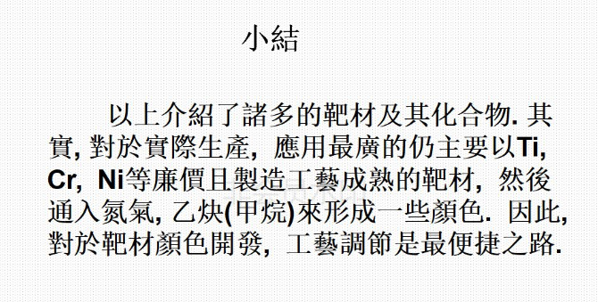 6)、目前能夠做出的膜層的顏色有深金黃色,淺金黃色,咖啡色、古銅色、灰色、黑色、灰黑色,七彩色等。通過控制鍍膜過程中的相關參數,可以控制鍍出的顏色;鍍膜結束后可以用相關的儀器對顏色值進行測量,使顏色得以量化,以確定所鍍出的顏色是否滿足要求。