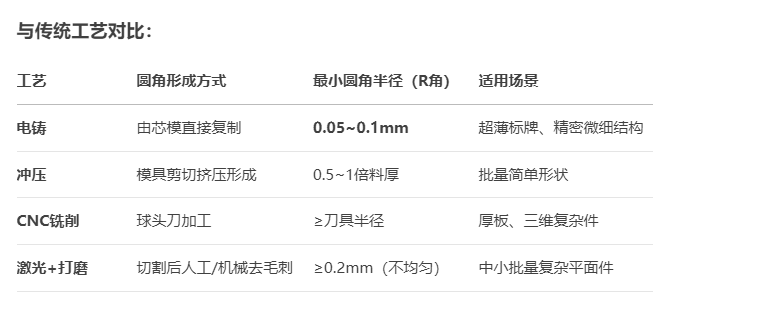 電鑄金屬標(biāo)牌的圓角形成原理與沖壓、CNC等減材工藝完全不同。電鑄是增材制造工藝,其圓角是通過芯模(模具)的設(shè)計與制作直接決定的,并在電沉積過程中完美復(fù)制出來。以下是詳細(xì)解析: