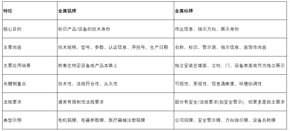 “金屬銘牌”和“金屬標(biāo)牌”這兩個詞在日常生活中經(jīng)常被混用,因為它們都是用金屬材料制成的牌子。但實際上,它們在使用目的、內(nèi)容、應(yīng)用場景和側(cè)重點上存在一些關(guān)鍵的區(qū)別: