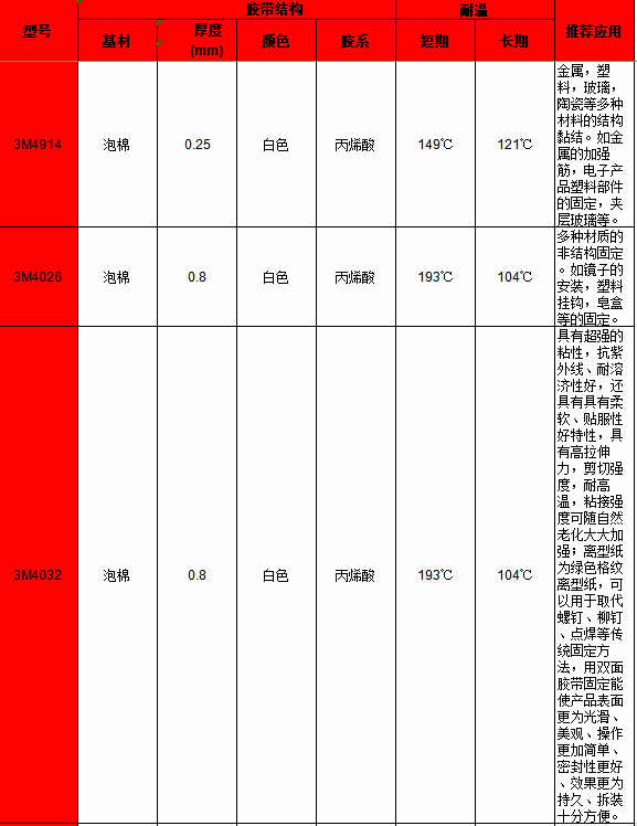 (以上是3M 4914、3M 4026、3M 4032相關型號特點說明)