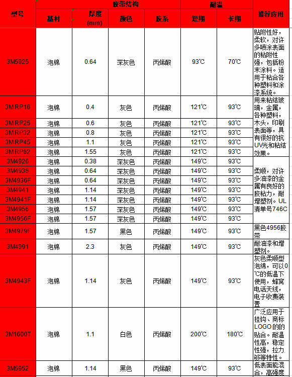 (上圖介紹的3M膠帶分別型號為:3M5925、3MRP16、3MRP25、3MRP32、3MRP45、3MRP62、3M4926、3M4936、3M4936F、3M4941、3M4941F、3M4956、3M4956F、3M4979F、3M4991、3M4943F、3M1600T、3M5952。)