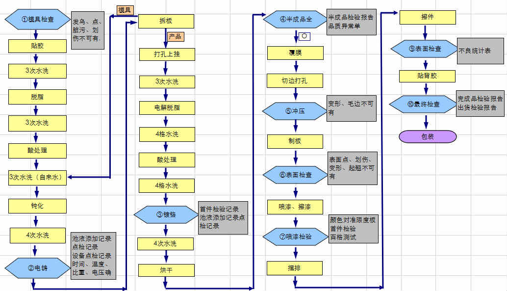 電鑄薄標生產(chǎn)工藝大致流程為:原材料檢查→拉板檢查→油墨檢查→菲林檢查→顯像檢查→掛件檢查→電鑄→鍍鉻→覆膜→刷膠→背膠檢查→表面檢查→最終檢查→包裝