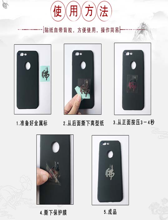二是將不干膠先印到轉移紙上,干燥后將轉移膜上的電鑄文字及圖案貼到膠膜上,壓緊后將不干膠膜轉移到電鑄文字及圖案的背面。